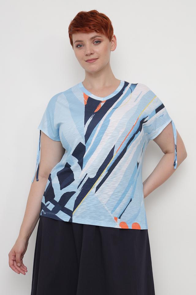 Женская футболка Thomas Rabe голубого цвета с оригинальным абстрактным принтом. Изготовлена из мягкой и приятной к телу ткани на основе вискозы и хлопка, обеспечивающей комфорт в носке. Состав: вискоза 50%, хлопок 50%