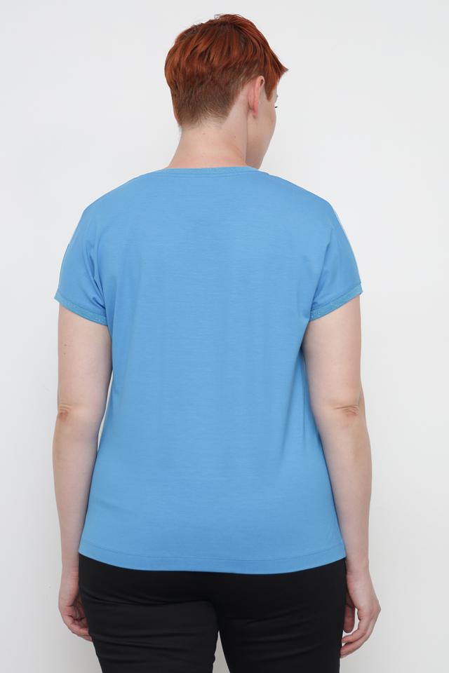 Модель имеет прямой крой и короткие рукава, что обеспечивает свободу движений. Круглый вырез горловины дополнен отделкой из ткани в тон изделия. Футболка изготовлена из высококачественной вискозы с добавлением эластана, благодаря чему она приятна к телу, хорошо драпируется и не мнется.