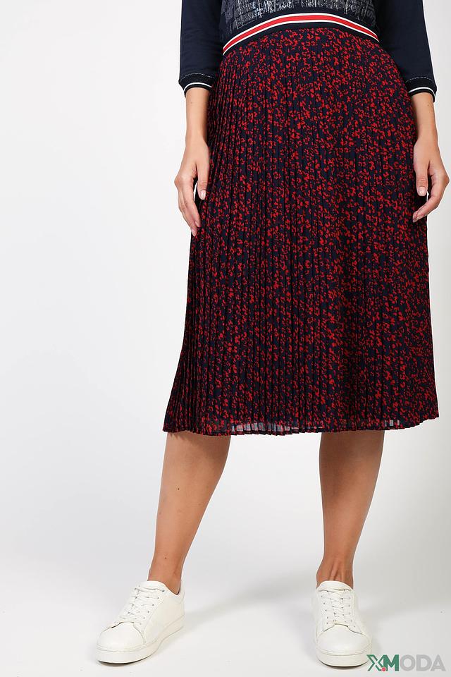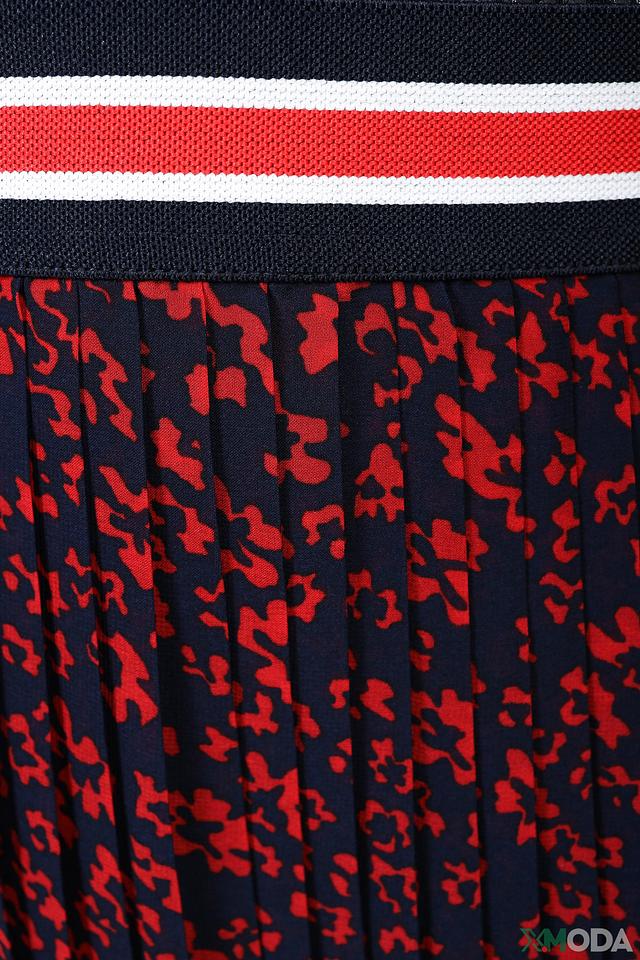 Юбка имеет классический плиссированный крой, который придает ей элегантность и динамичность. Яркий цветочный принт в красных тонах на темно-синем фоне делает эту модель особенно привлекательной и запоминающейся.