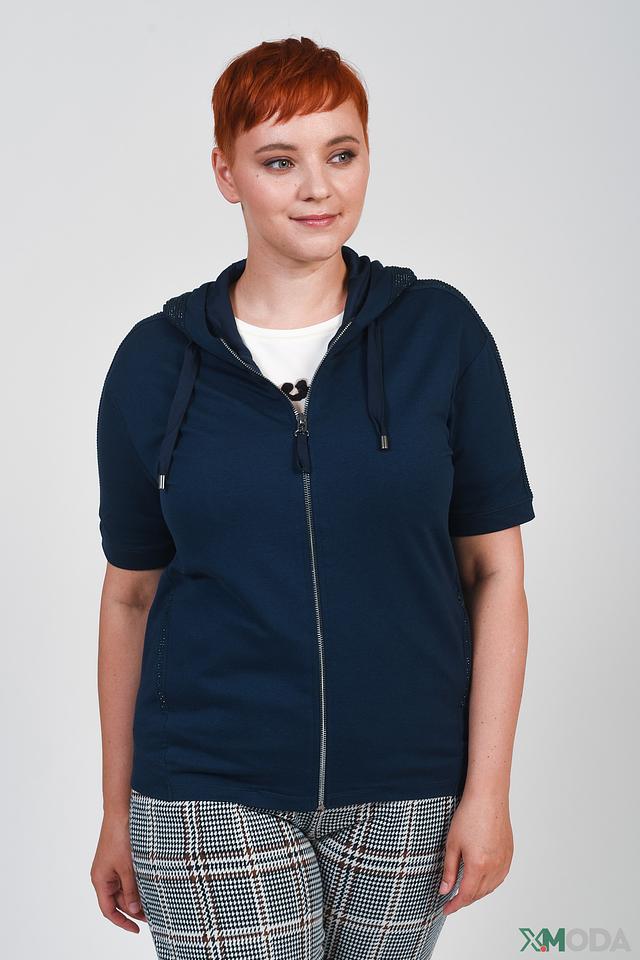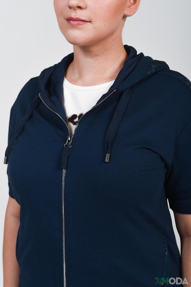 Синий жакет Thomas Rabe с коротким рукавом и капюшоном на молнии. Модель выполнена из мягкой ткани с добавлением хлопка и модала, обеспечивающей комфорт в носке. Застежка – молния. Состав: хлопок 47%, модал 47%, эластан 6%