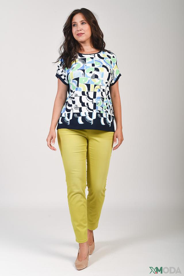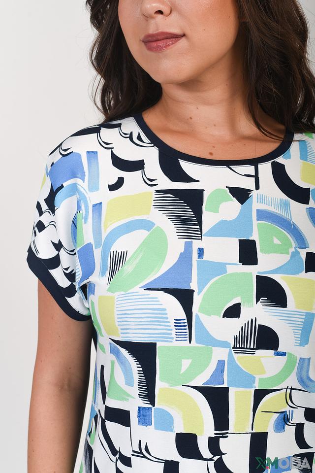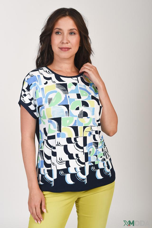 Женская футболка Thomas Rabe синего цвета с ярким геометрическим принтом. Изготовлена из мягкой вискозы с добавлением эластана для комфорта и хорошей посадки. Состав: вискоза 92%, эластан 8%