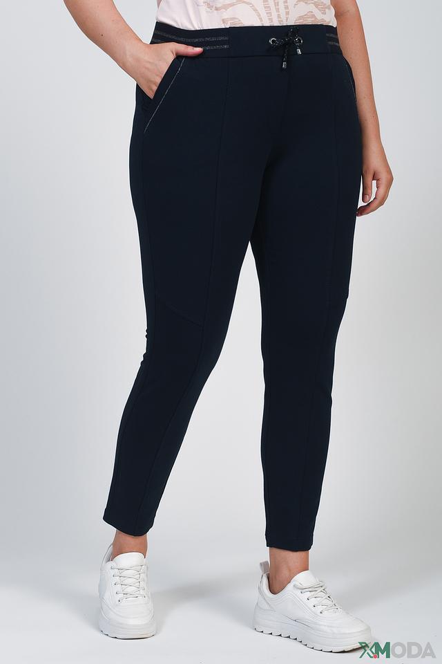 Брюки имеют удобный эластичный пояс с регулирующим шнурком, обеспечивающий комфортную посадку по фигуре. Декоративные вставки на передней части брюк добавляют им стильный акцент и визуально вытягивают силуэт.