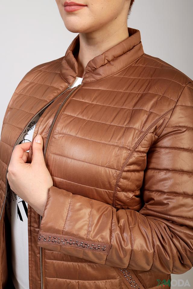 Модель имеет удобную застежку-молнию, воротник-стойку и боковые карманы. Рукава куртки слегка спущены, что обеспечивает комфортную посадку. Декоративная отделка на карманах и по краям куртки добавляет изысканности.