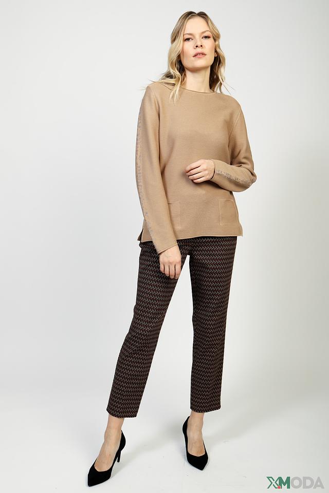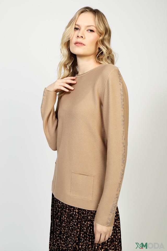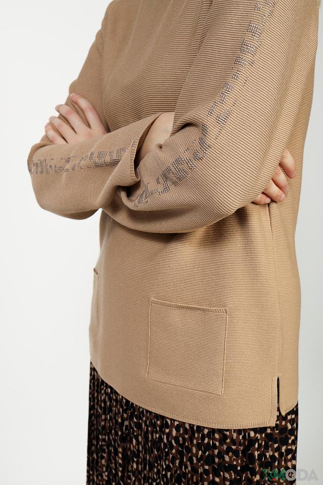 Пуловер имеет классический крой с округлым вырезом горловины и рукавами три четверти. На передней части изделия расположен накладной карман, добавляющий практичности и оригинальности. Боковые разрезы по низу изделия придают ему современный вид.