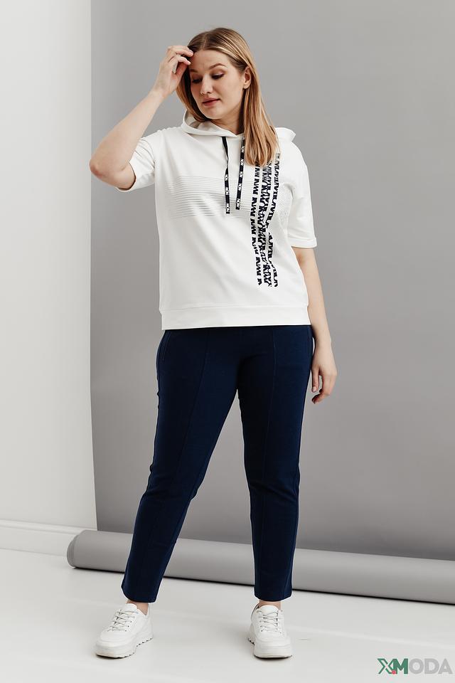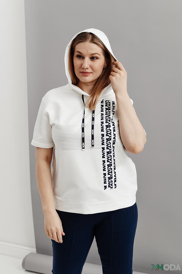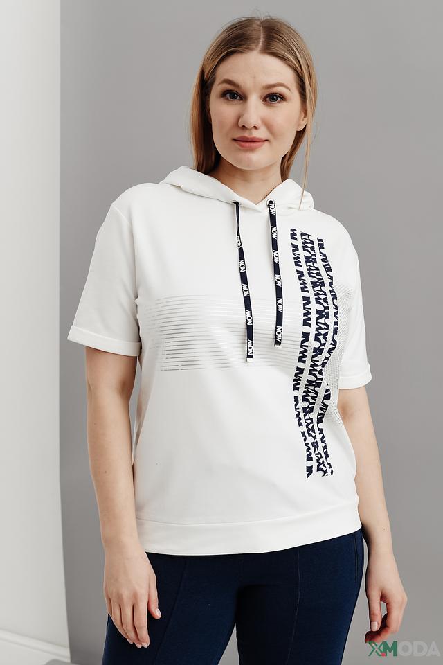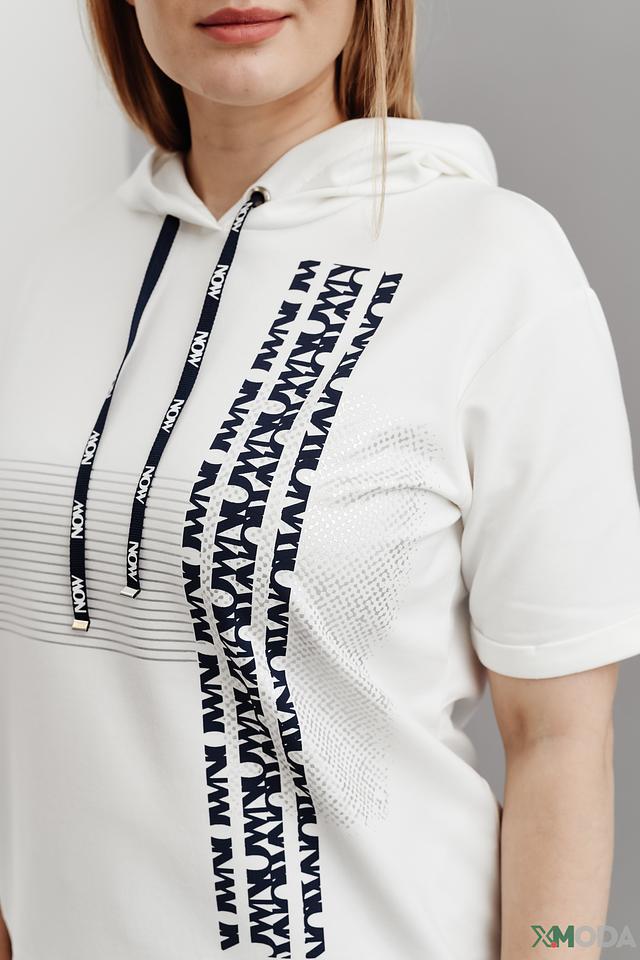 Белый джемпер от Thomas Rabe с коротким рукавом и капюшоном. Модель выполнена из мягкого трикотажа с декоративной отделкой в виде надписей на рукавах и капюшоне. Состав: полиэстер 70%, хлопок 25%, эластан 5%