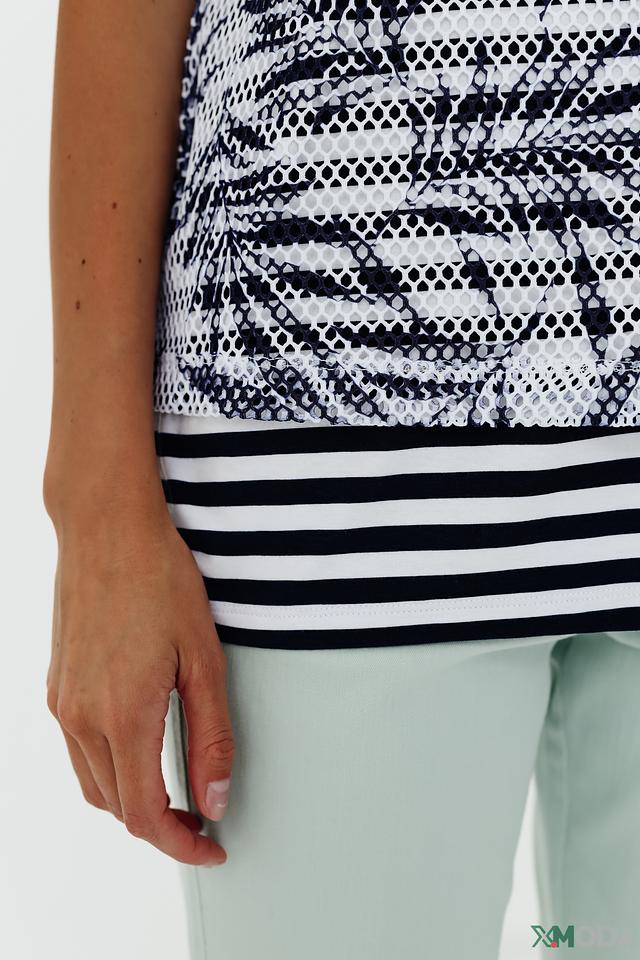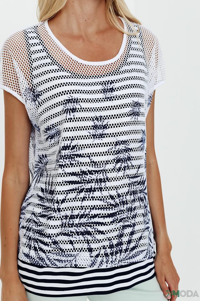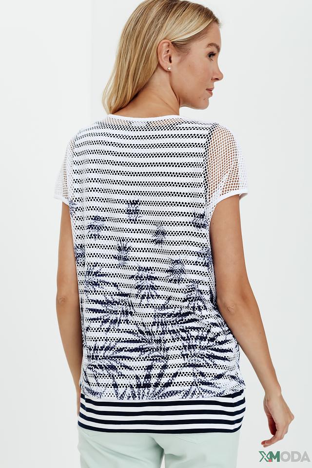 Основной цвет футболки – белый, украшен эффектным принтом в сине-черных тонах. Верхняя часть изделия выполнена из сетчатой ткани, что придает ей легкость и воздушность. Нижняя часть отделана горизонтальными полосами в темно-синем и белом цвете.