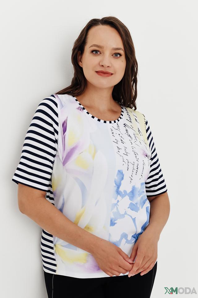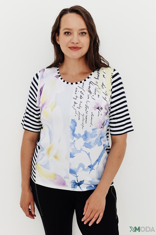 Женская блуза Thomas Rabe белого цвета с ярким цветочным принтом и полосатыми рукавами. Модель выполнена из мягкой вискозы с добавлением эластана для комфорта и свободы движений. Состав: вискоза 96%, эластан 4%