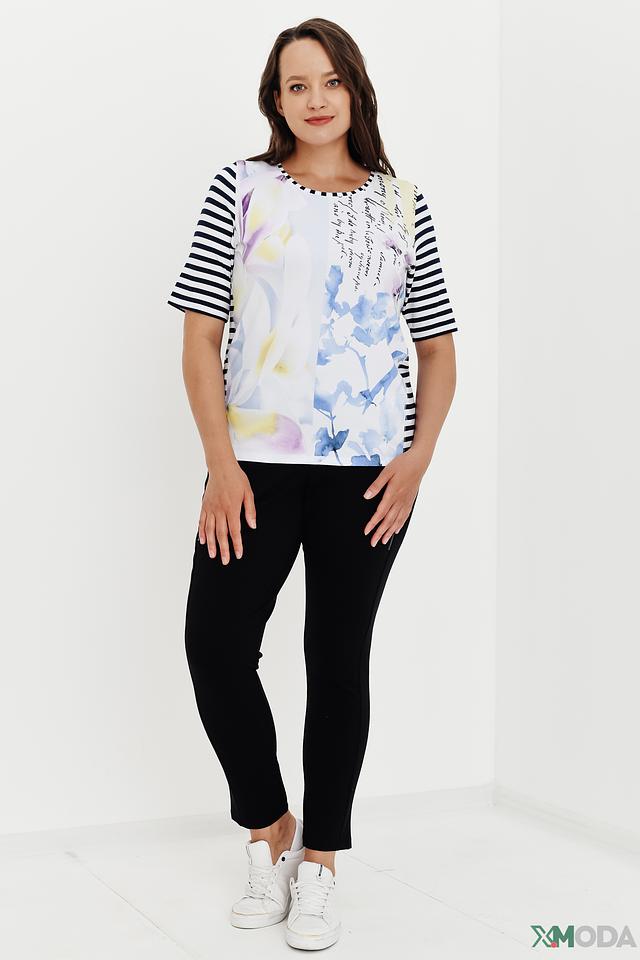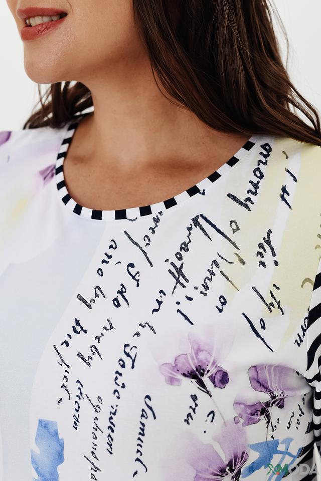 Основной цвет блузы – белый, который служит идеальным фоном для яркого цветочного принта. Рисунок выполнен в нежных оттенках сиреневого, фиолетового и зеленого, создавая романтичное и женственное настроение. Рукава блузы выполнены в классическую полоску – сочетание белого и темно-синего цветов.