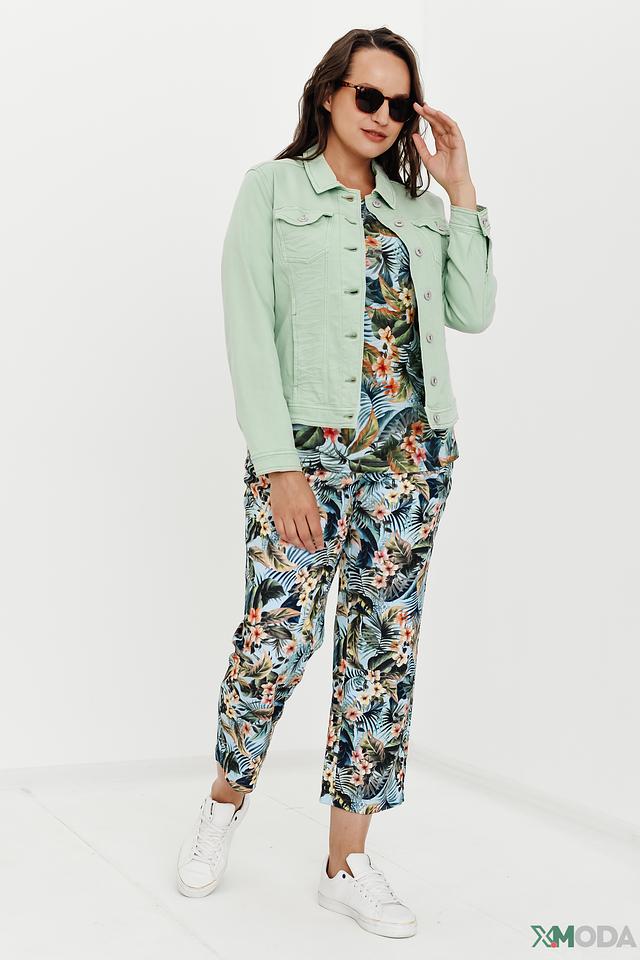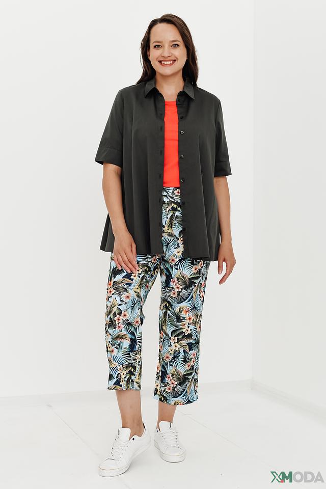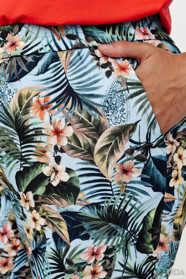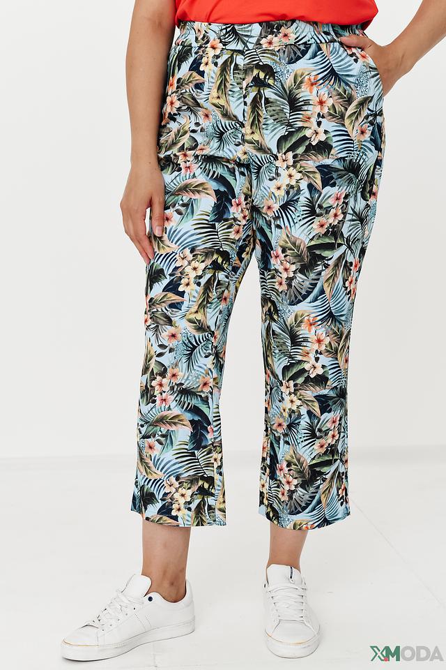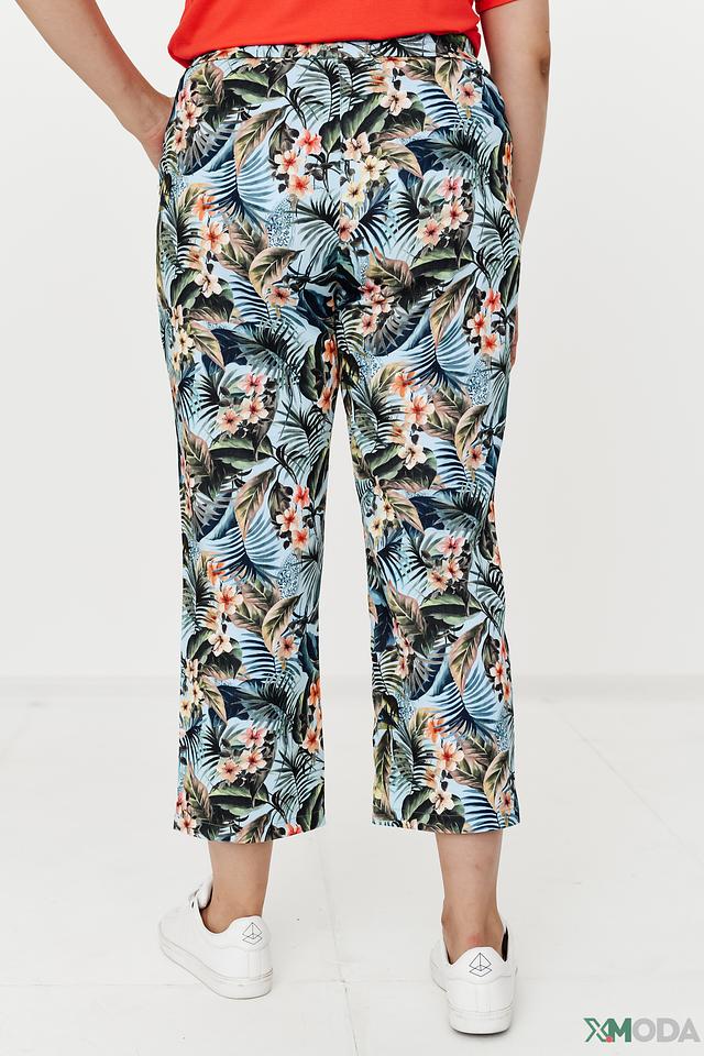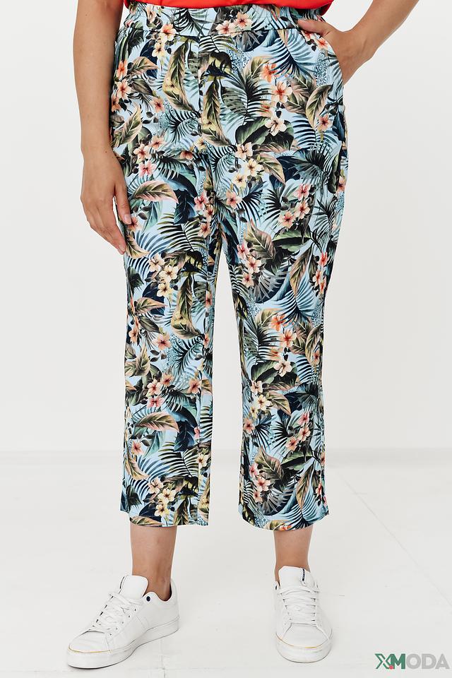 Особенностью модели является эффектный принт с изображением тропических листьев и цветов. Брюки имеют зауженный к низу силуэт и эластичный пояс на талии, что обеспечивает идеальную посадку по фигуре. Укороченная длина делает их отличным выбором для летних прогулок и отдыха.