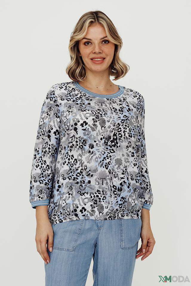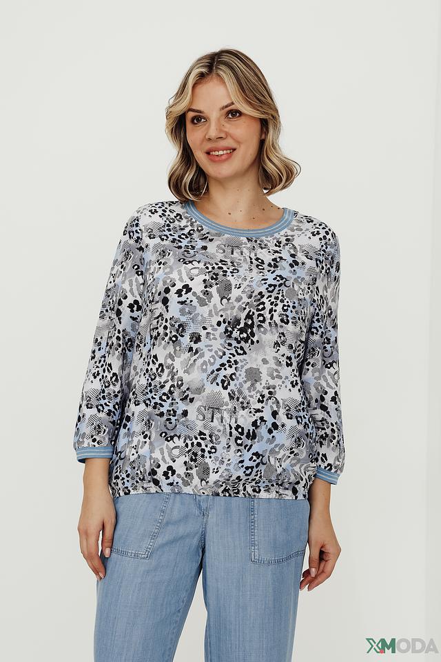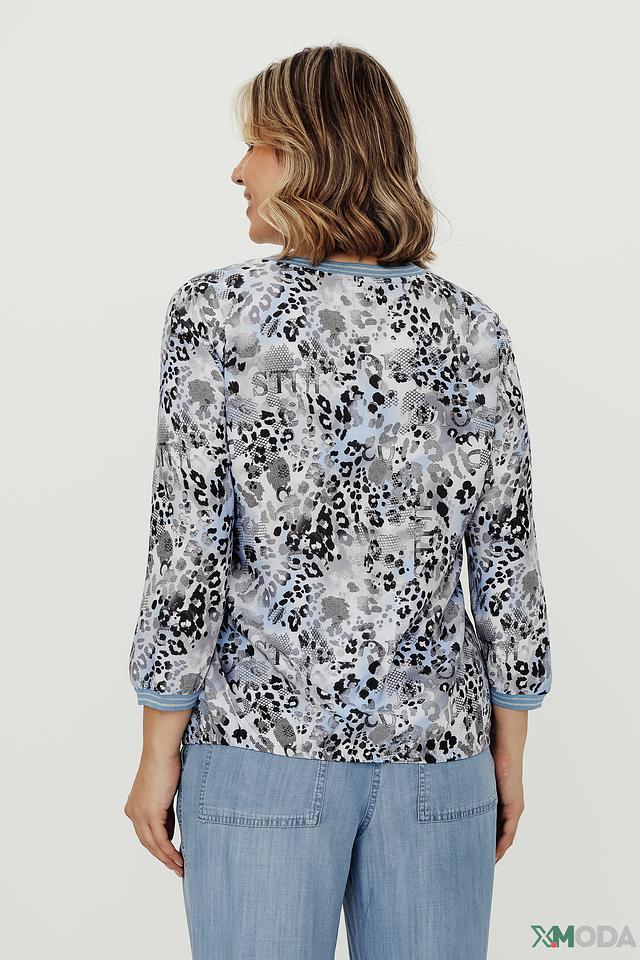 Блуза имеет свободный крой, который не сковывает движения. Особенностью модели является яркий принт, сочетающий в себе абстрактные узоры и имитацию леопардовой расцветки в серых и белых тонах на светло-голубом фоне.