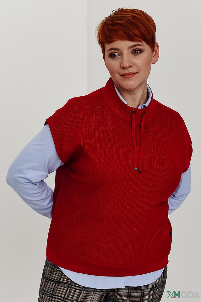 Жилет имеет насыщенный красный цвет и прямой крой. Воротник-стойка добавляет модели элегантности, а завязки на капюшоне позволяют регулировать посадку и создавать разные образы.