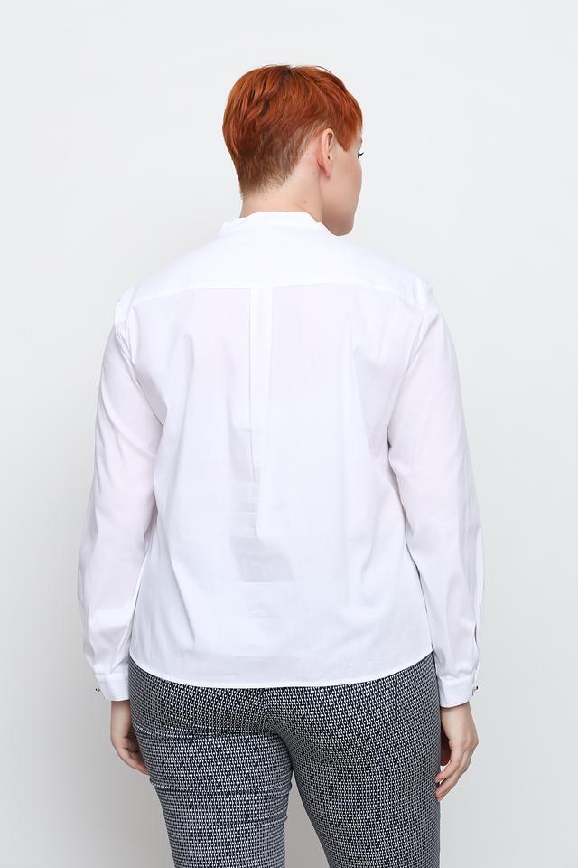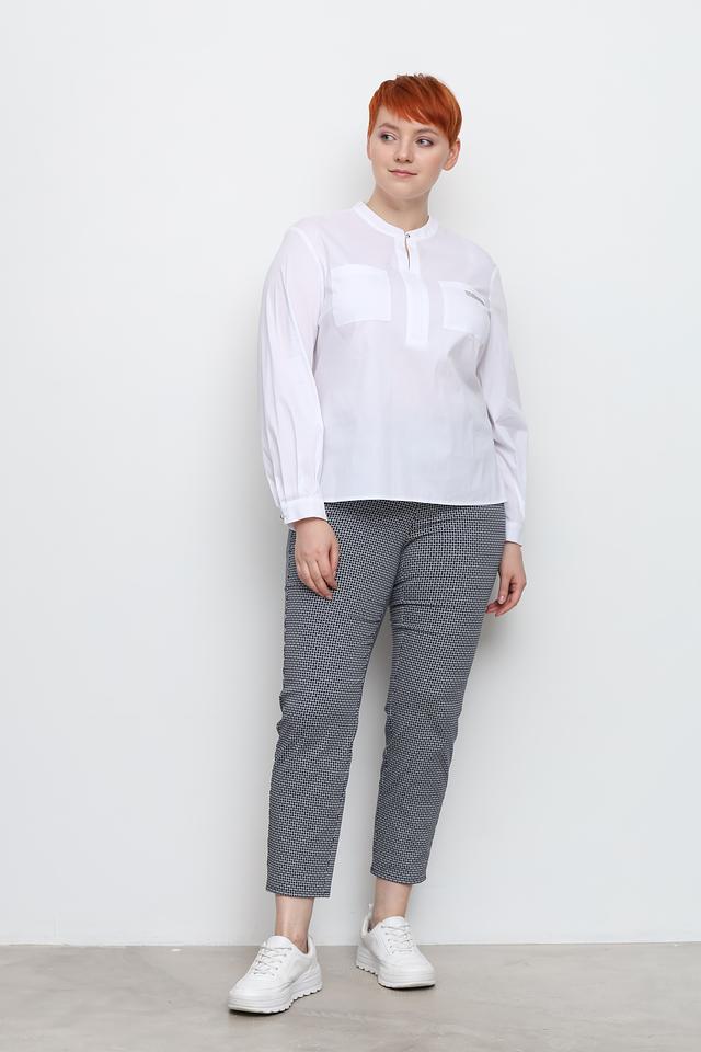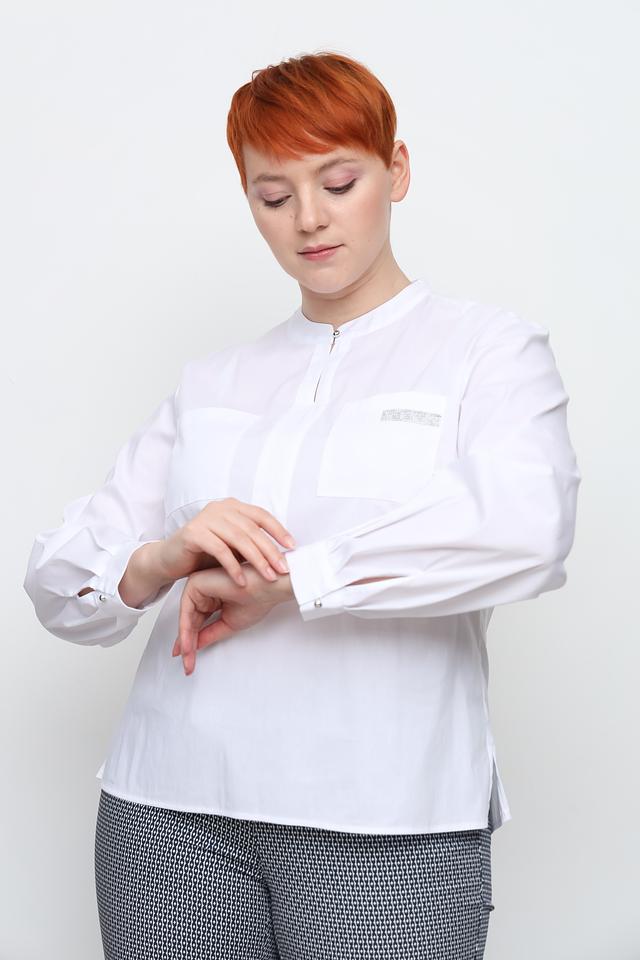 Блуза имеет прямой крой, длинные рукава с манжетами и воротник-стойку с небольшой V-образной горловиной, застегивающейся на пуговицу. На груди расположена накладная карман, который декорирован рядом изящных страз, придающих блузе особый шарм.
