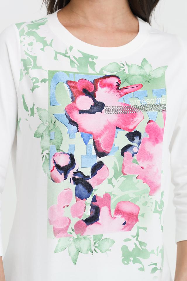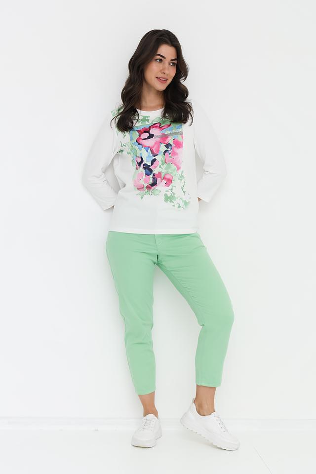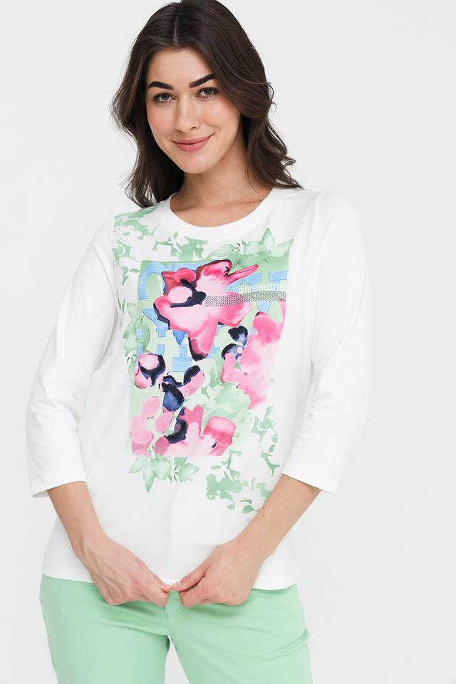 Основной цвет футболки – белый, который служит идеальным фоном для яркого и красочного цветочного принта. Принт выполнен в акварельной технике, с использованием оттенков розового, зеленого и синего, что придает изделию свежий и романтичный вид.