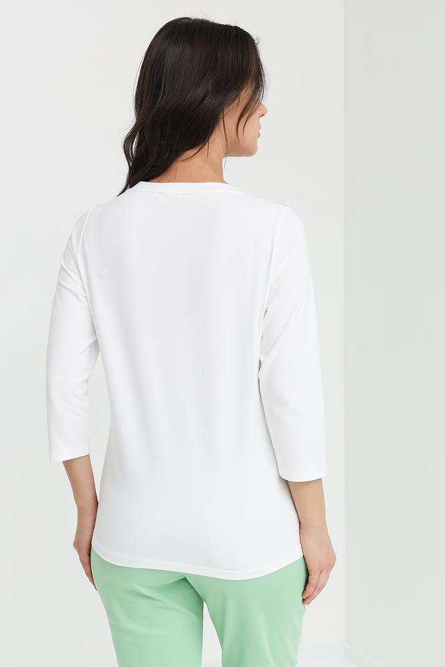 Фасон футболки – свободный, прямой крой, который не сковывает движения. Рукава – три четверти, что делает ее подходящей для теплой погоды. Вырез горловины – округлый, классический. Эта модель прекрасно сочетается с джинсами, брюками или юбками, создавая стильный и непринужденный образ.