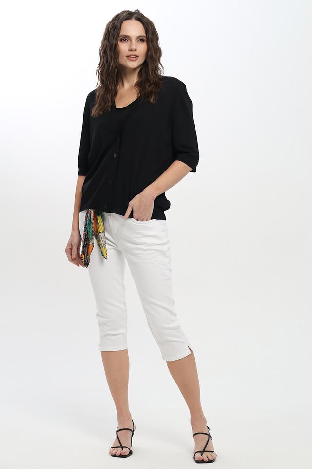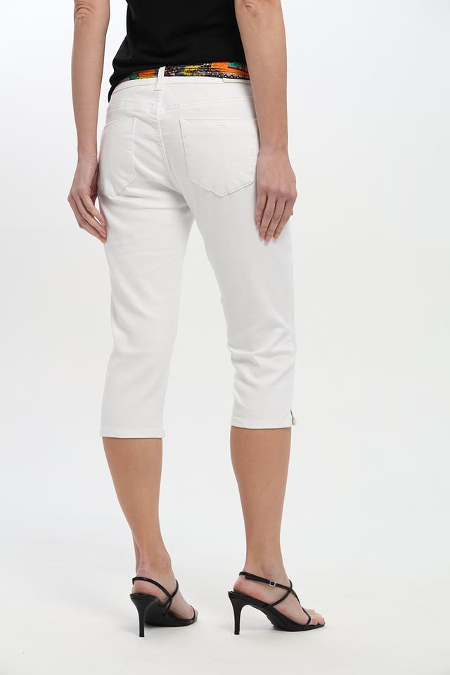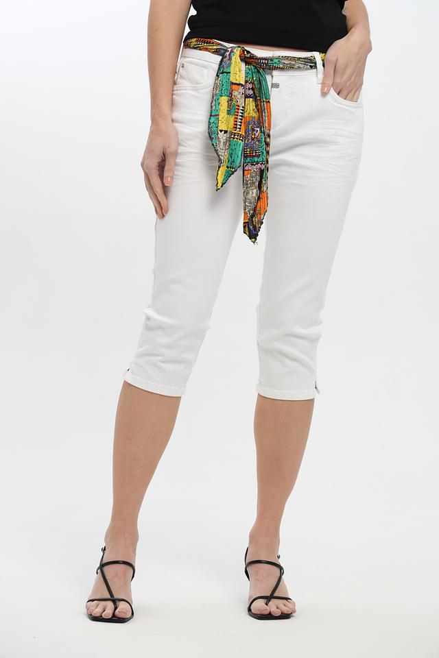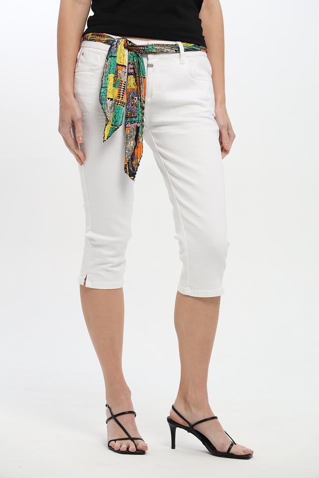 Бриджи имеют классический крой и белый цвет, который легко сочетается с различными элементами одежды. Оригинальный пояс с ярким принтом добавляет образу изюминку и позволяет создать неповторимый стиль.