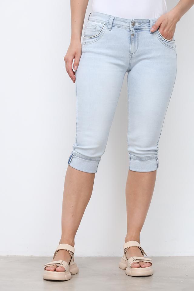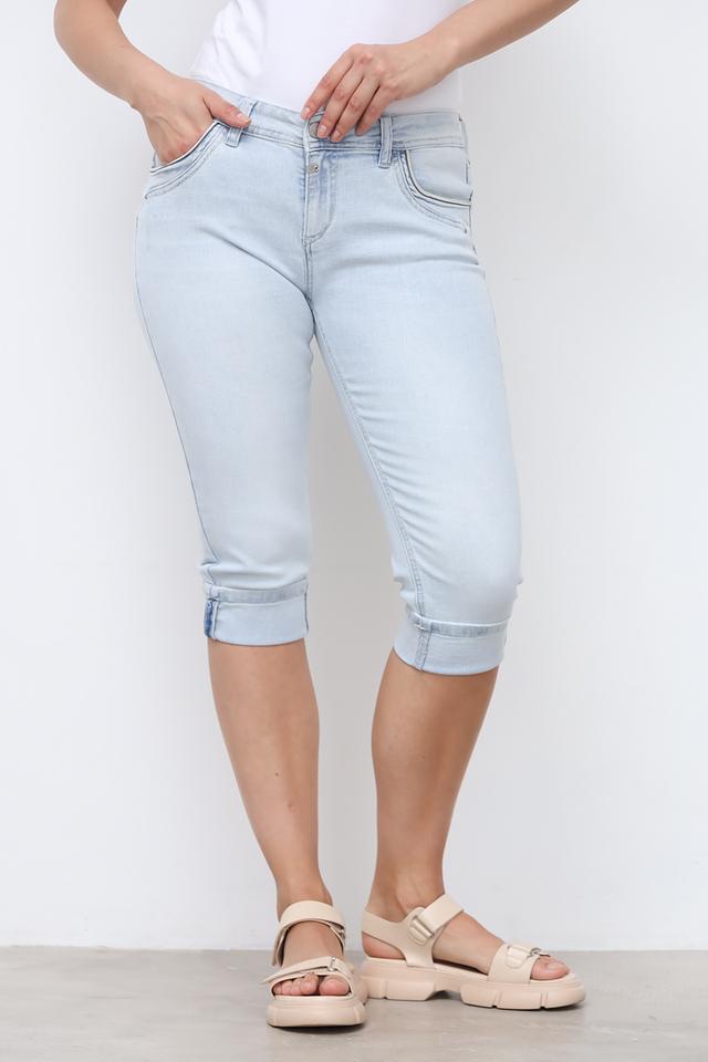 Бриджи имеют светло-голубой цвет и зауженный крой, который подчеркивает фигуру. Укороченная длина делает их идеальным выбором для теплой погоды. Эффект потертости придает им стильный и современный вид.