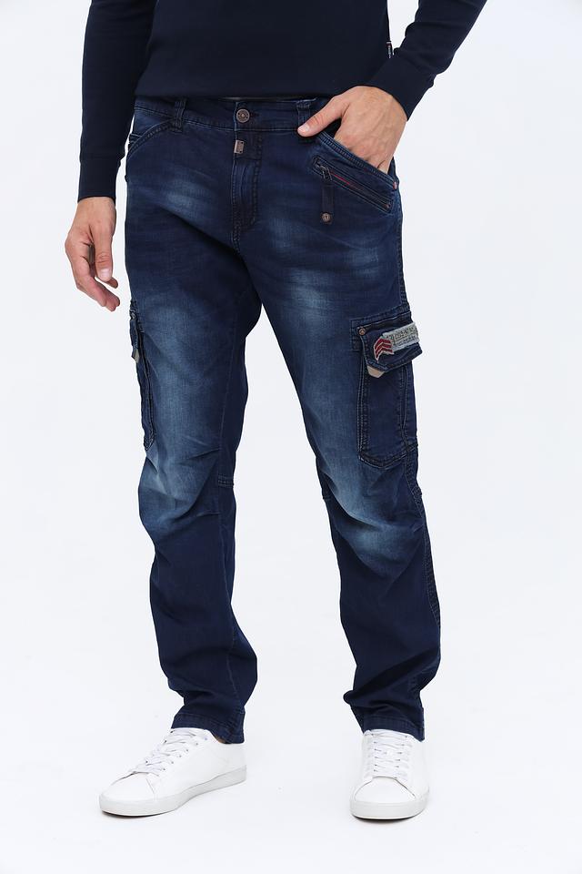 Мужские джинсы Time Zone тёмно-синего цвета в стиле карго с удобным кроем и функциональными карманами. Модель отличается стильным дизайном с эффектом потёртости и декоративными элементами. Состав: хлопок 99%, эластан 1%