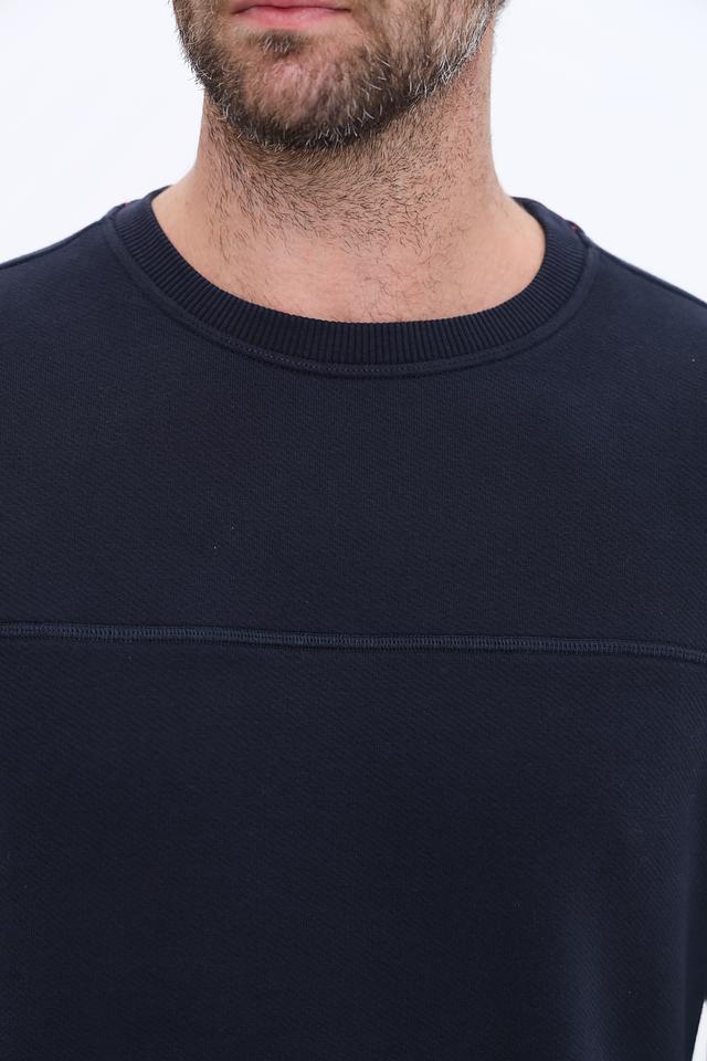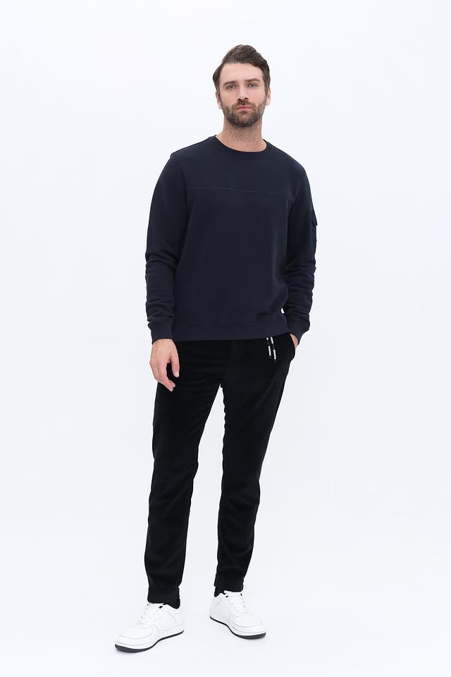 Джемпер имеет прямой крой, круглый вырез горловины и длинные рукава с манжетами. На груди расположена горизонтальная вставка, добавляющая визуальный интерес. С левой стороны на рукаве имеется накладной карман на молнии.