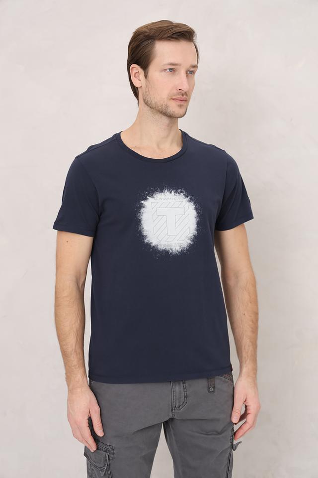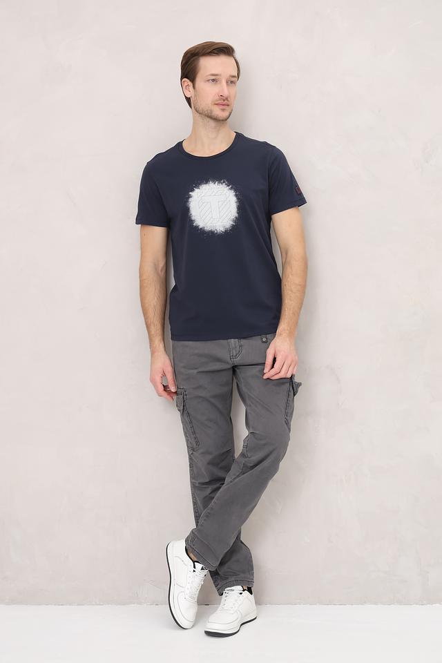 Мужская футболка Time Zone темно-синего цвета с оригинальным белым принтом на груди. Изготовлена из 100% хлопка, обеспечивающего комфорт и воздухопроницаемость. Отличный выбор для повседневного образа. Состав: хлопок 100%