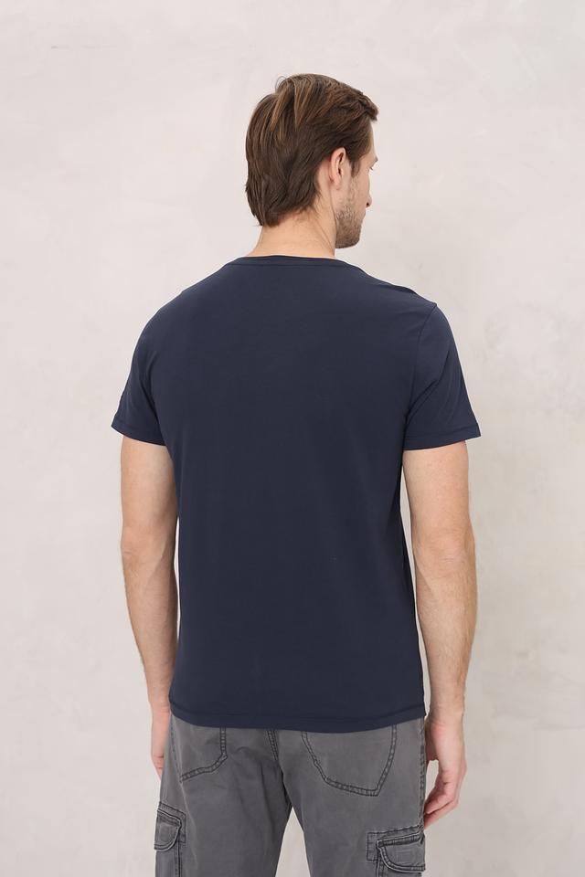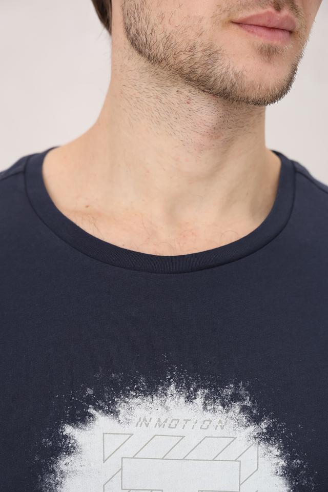 Основной цвет футболки – глубокий темно-синий, который легко сочетается с различными элементами одежды. Главная особенность модели – стильный белый принт на груди, добавляющий образу индивидуальность.