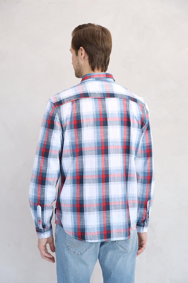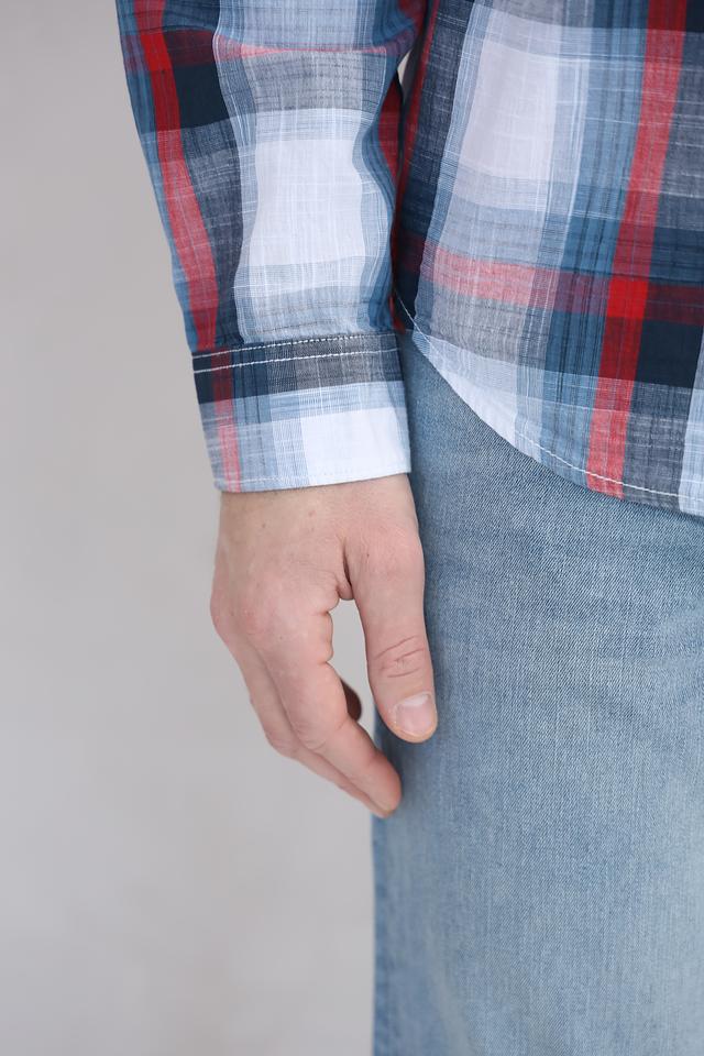Рубашка выполнена в классической клетке сине-красных оттенков, что делает ее универсальной и подходящей для различных образов. Она имеет стандартный крой, длинные рукава и воротник с пуговицами.