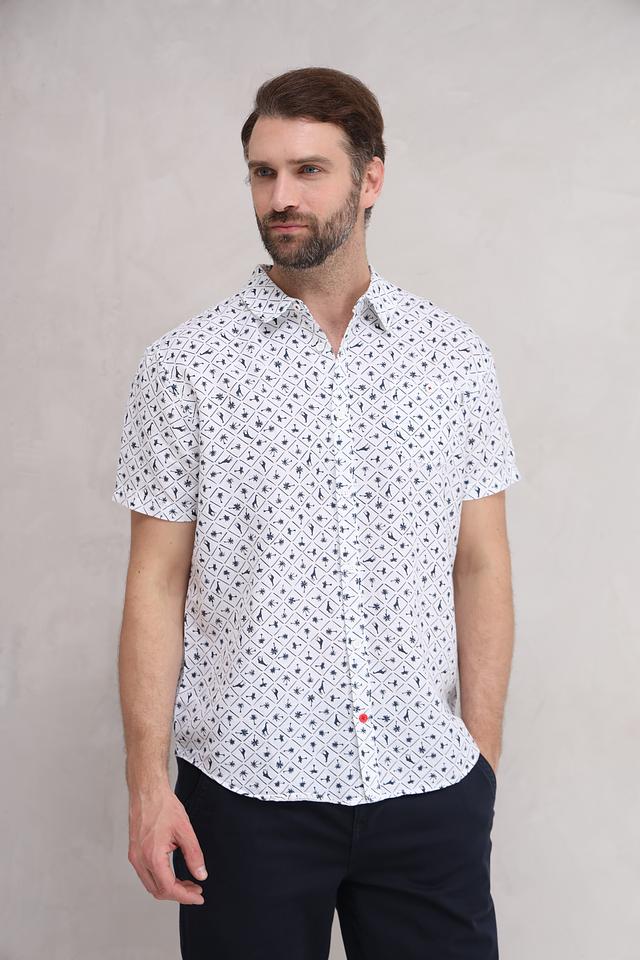 Мужская рубашка Time Zone белого цвета с оригинальным принтом в виде силуэтов животных. Модель с коротким рукавом выполнена из смесовой ткани на основе льна и хлопка, обеспечивающей комфорт в жаркую погоду. Состав: лен 55%, хлопок 45%