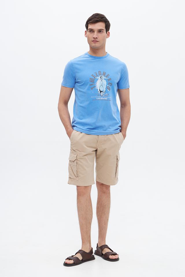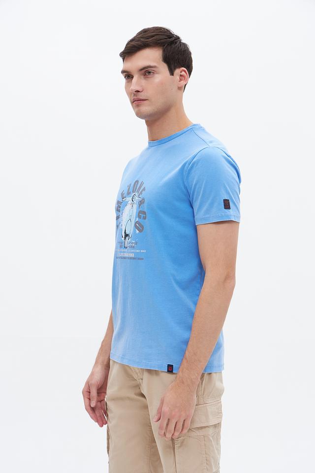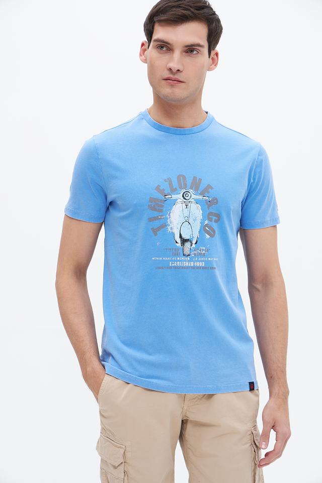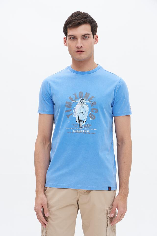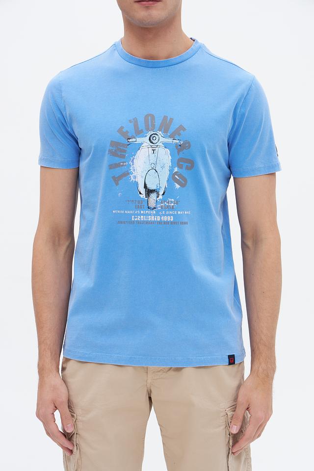 Голубая футболка Time Zone с ярким принтом в виде мотороллера – отличный выбор для создания повседневного образа. Изготовлена из 100% хлопка, обеспечивающего комфорт и воздухопроницаемость. Состав: хлопок 100%