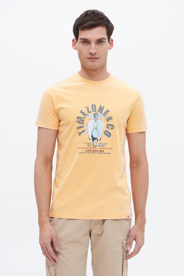 Эта футболка от Time Zone станет отличным дополнением к вашему гардеробу. Выполнена в светло-жёлтом цвете и украшена оригинальным принтом с изображением скутера и надписями.