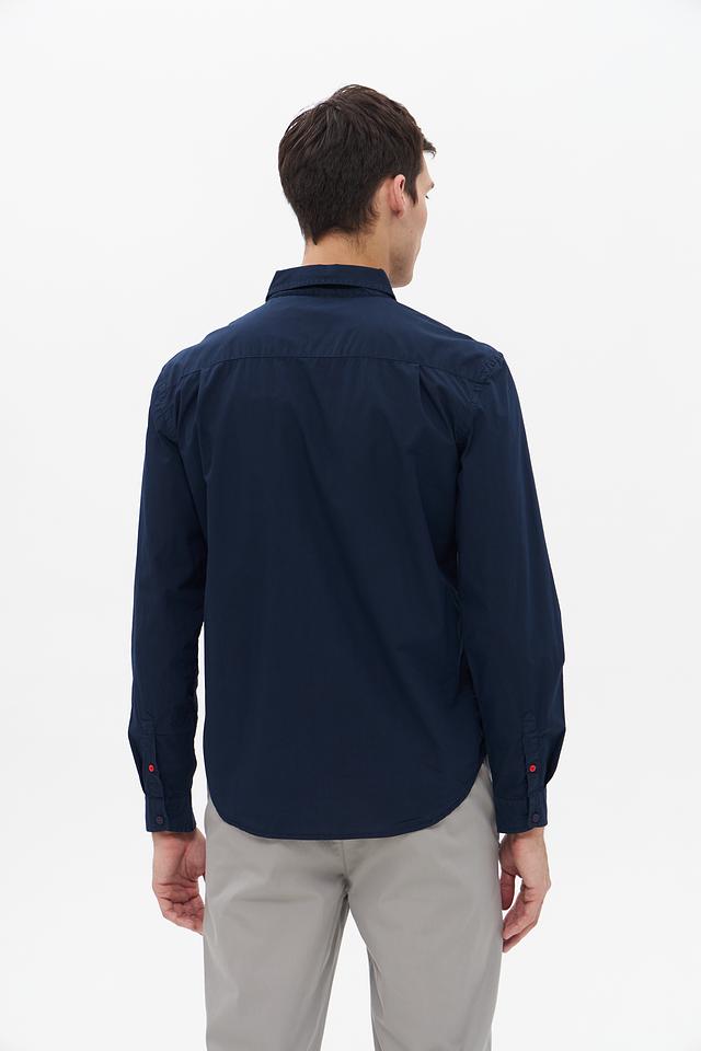 Основной цвет рубашки – насыщенный синий, который легко сочетается с различными элементами гардероба. На груди расположен накладной карман с декоративной отделкой, а на манжетах и воротнике – контрастная красная окантовка, добавляющая изюминку.