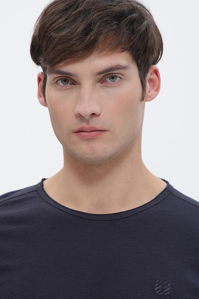 Футболка имеет классический крой с длинными рукавами и круглым вырезом горловины. Темно-синий цвет делает ее универсальной и легко сочетаемой с различными элементами гардероба. Небольшой логотип бренда, расположенный на груди, добавляет сдержанную элегантность.