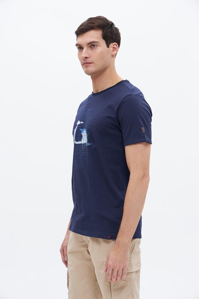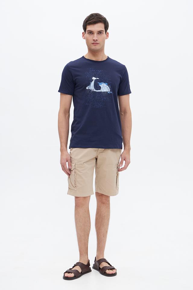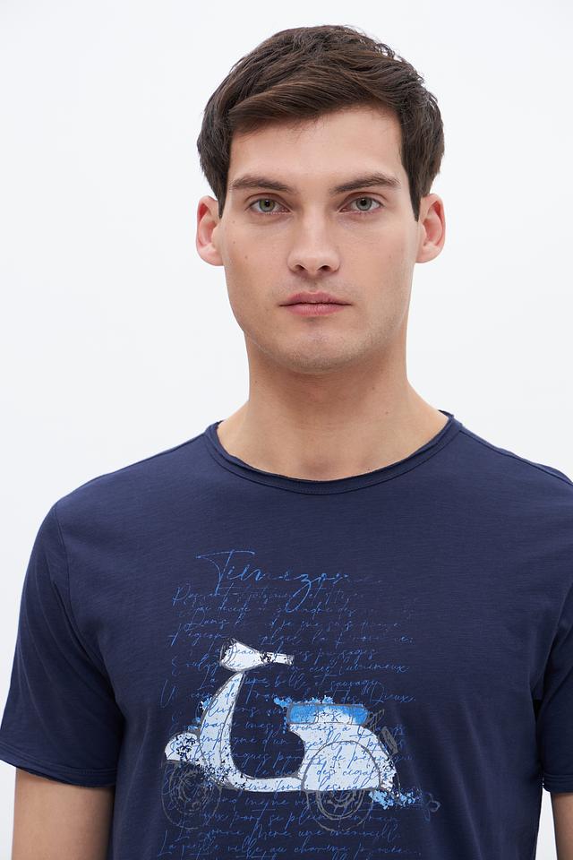 Мужская футболка Time Zone темно-синего цвета с оригинальным принтом в виде мотороллера. Изготовлена из 100% хлопка, обеспечивающего комфорт и воздухопроницаемость. Состав: хлопок 100%