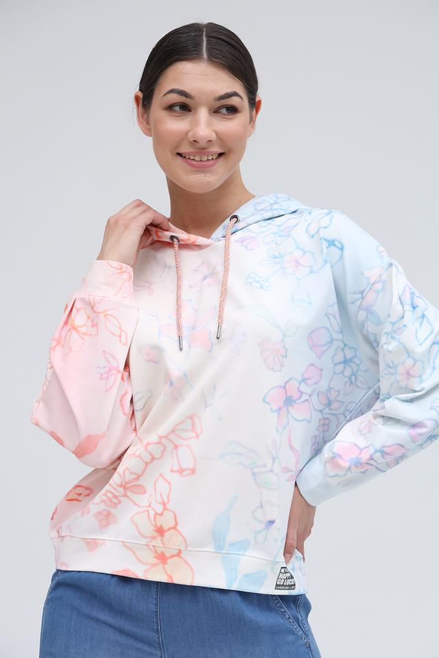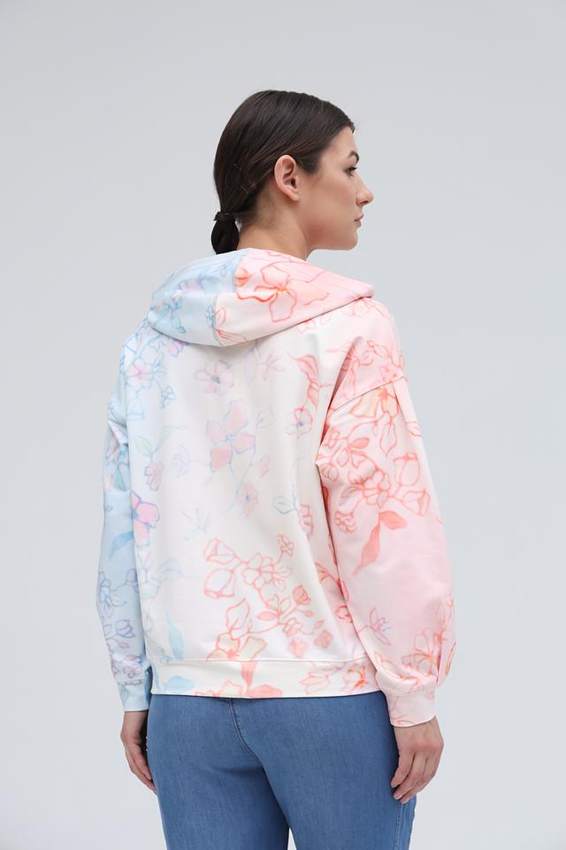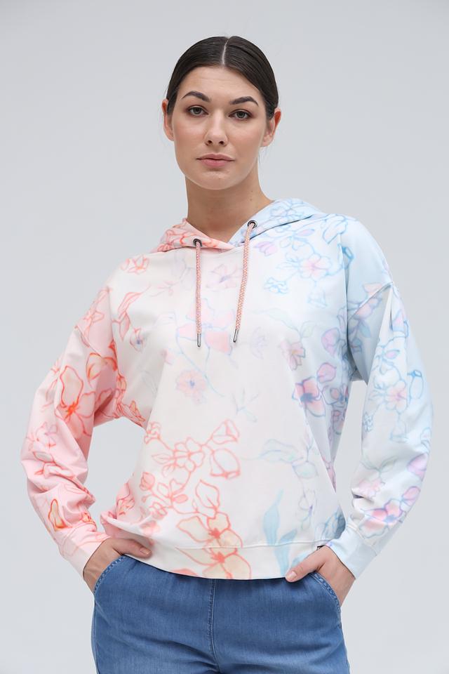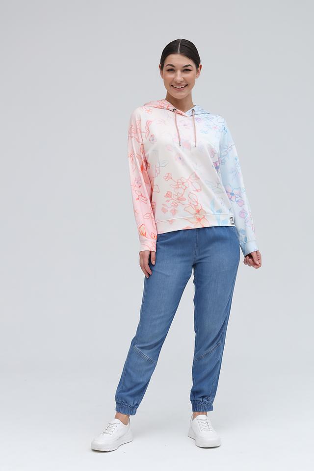 Толстовка имеет свободный крой, капюшон со шнурками и удобные карманы. Оригинальный цветочный принт в нежных розовых и голубых тонах придаёт ей особый шарм и женственность.