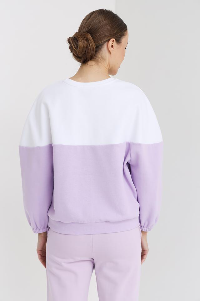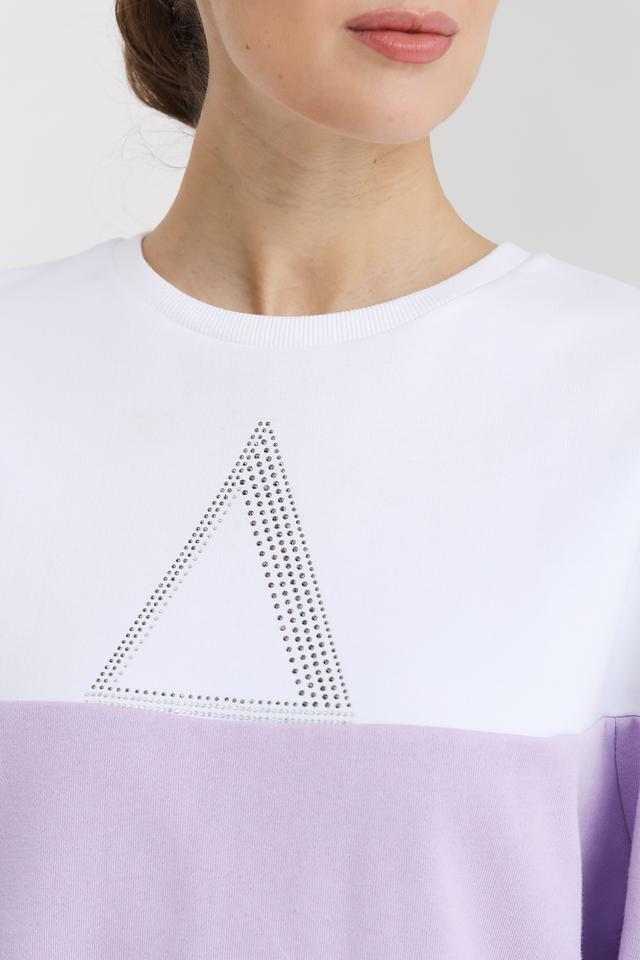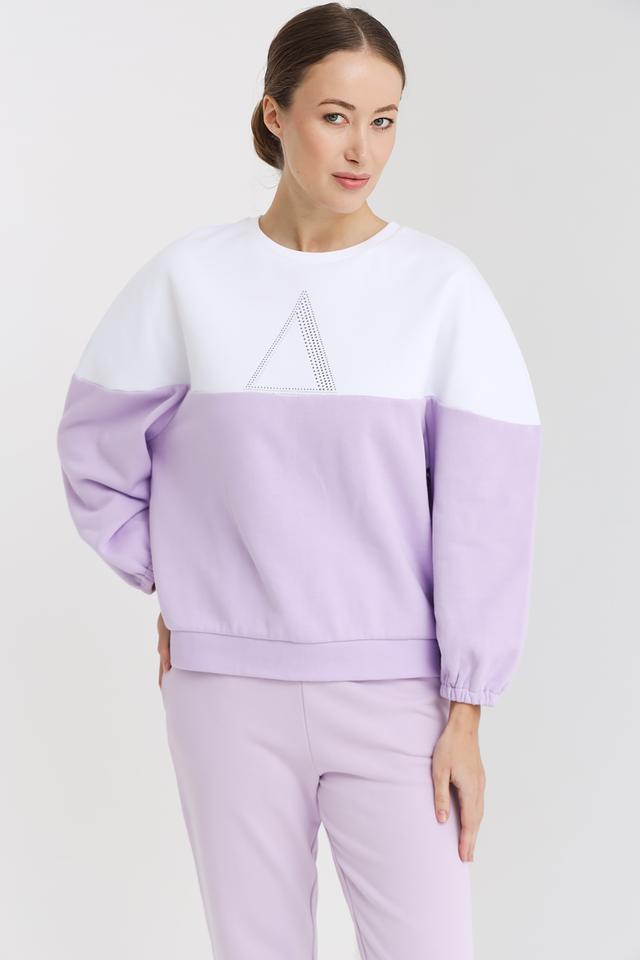 Эта женская толстовка от Pezzo сочетает в себе комфорт и стиль. Модель выполнена в двухцветной гамме: лавандовый и белый, что придает ей современный вид. Передняя часть толстовки украшена треугольным элементом, инкрустированным стразами, добавляющим изысканности.