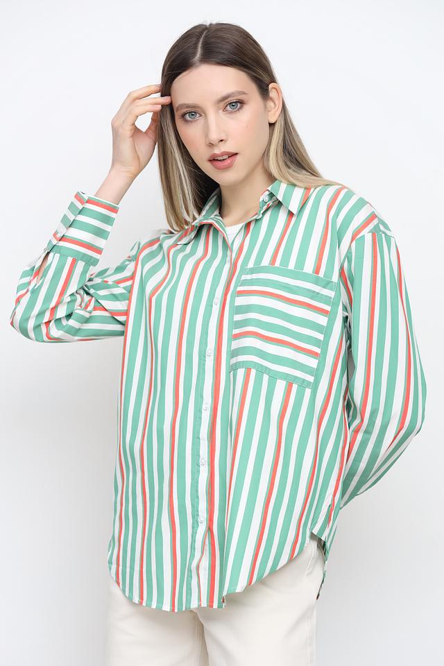 Женская рубашка Tom Tailor зеленого цвета в полоску с длинным рукавом. Стильная модель свободного кроя с накладным карманом добавит легкости вашему образу. Состав: хлопок 69%, полиамид 26%, эластан 5%