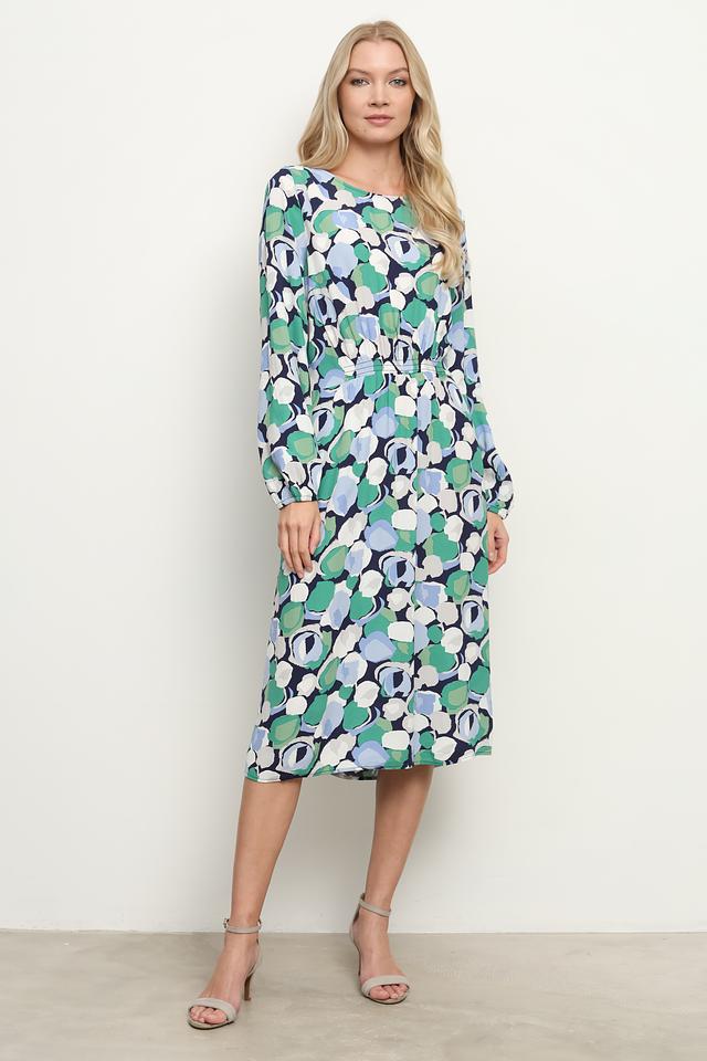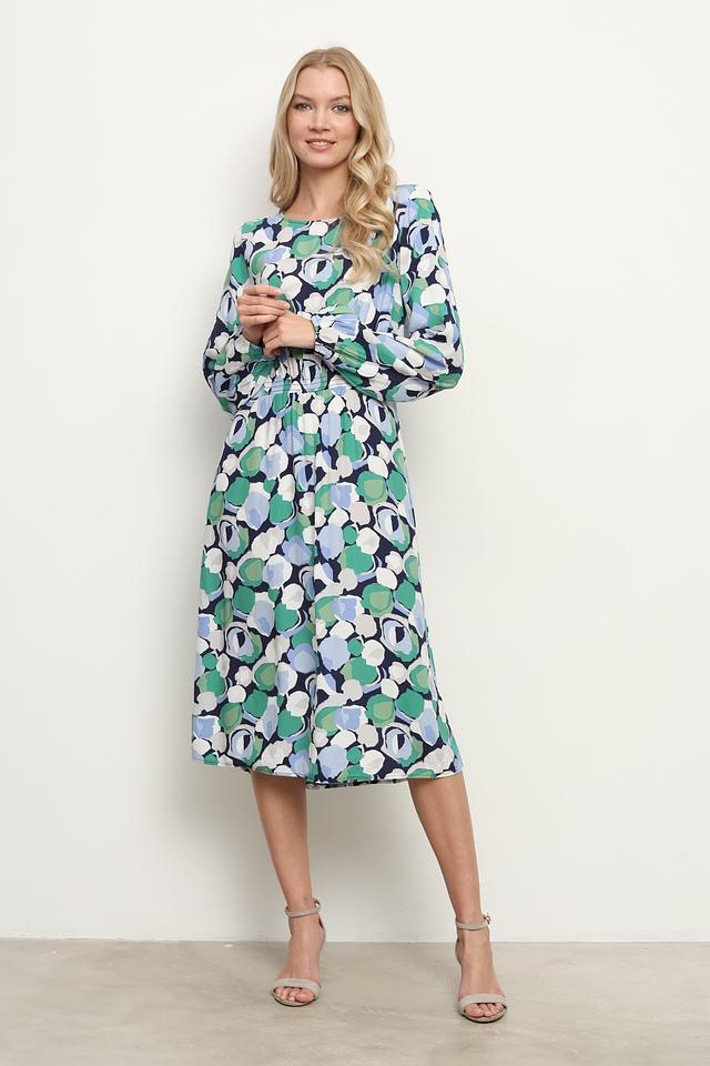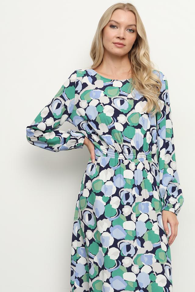 Платье имеет длину миди и свободный крой, который не сковывает движений. Вырез горловины – округлый, а длинные рукава слегка спущены, что придаёт образу лёгкость и непринуждённость. Талию акцентирует эластичная резинка с небольшими складками.