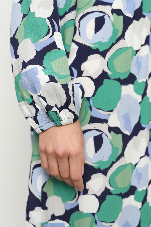 Особенностью этого платья является яркий и оригинальный цветочный принт, выполненный в сочетании синего, зелёного и голубого цветов. Это делает платье особенно привлекательным и позволяет создать яркий и запоминающийся образ. Платье идеально подходит для прогулок, встреч с друзьями или работы.