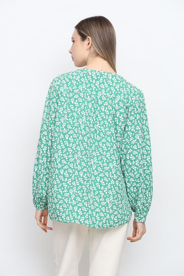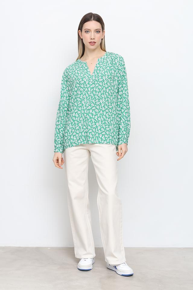 Блуза имеет прямой крой, V-образный вырез горловины и длинные рукава с небольшими сборками на манжетах. По всей поверхности изделия расположен мелкий цветочный принт, который придает ей женственность и романтичность.