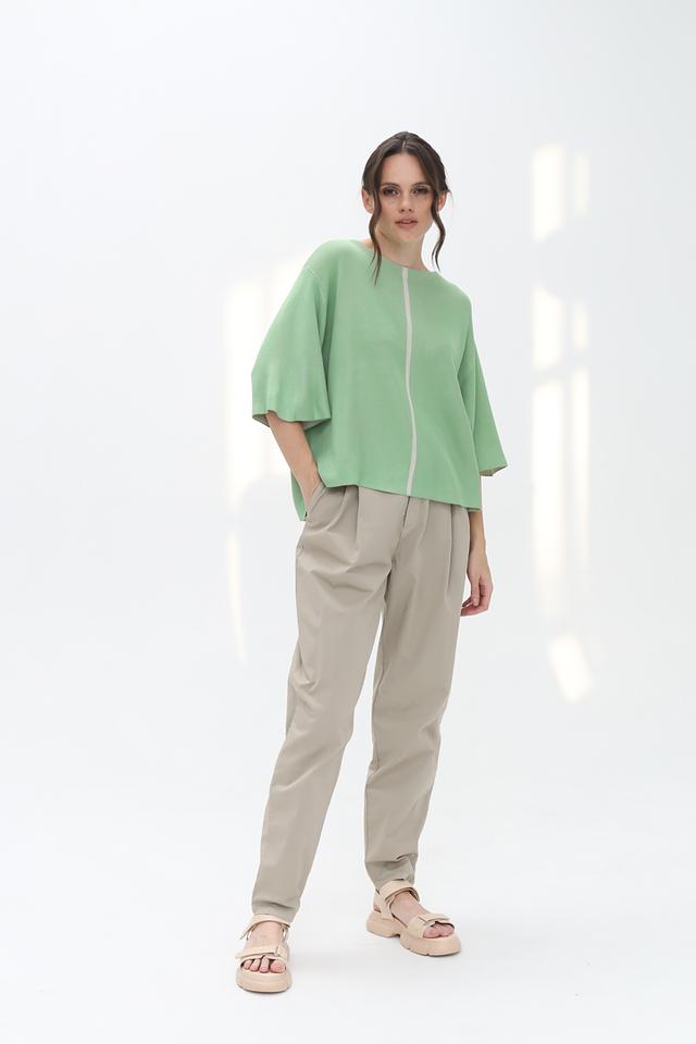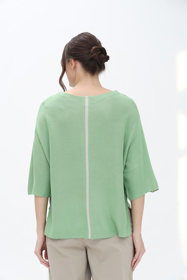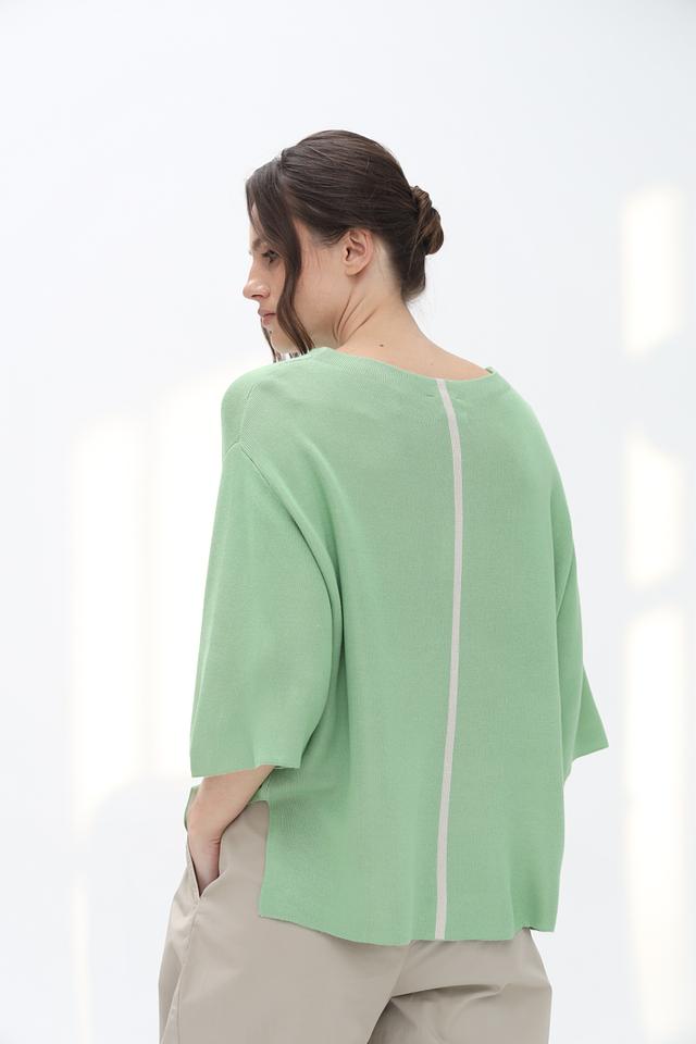 Пуловер имеет свободный крой и короткие рукава, что придает ему современный и непринужденный вид. Отличительной особенностью модели является вертикальная полоса на лицевой стороне, выполненная в светло-сером цвете, которая визуально вытягивает силуэт.