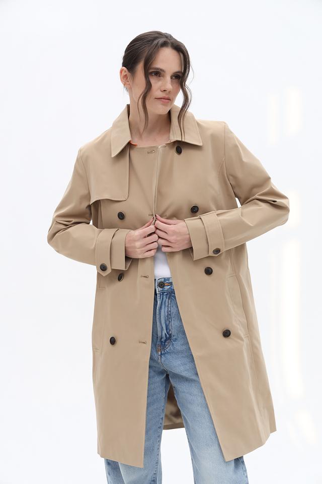 Плащ имеет двубортный крой с широким поясом, который позволяет регулировать силуэт и подчеркнуть талию. Застёжка на пуговицах обеспечивает надёжную фиксацию, а отложной воротник добавляет элегантности.