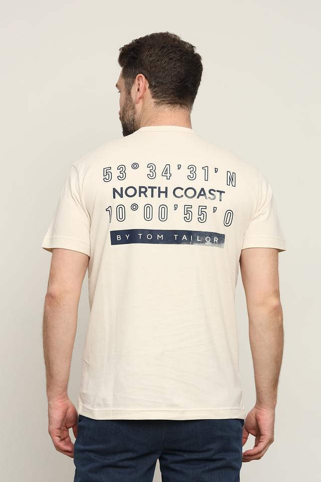 На передней части футболки расположен небольшой принт с надписью, а на спине – более крупный графический элемент с указанием географических координат и названием бренда. Круглый вырез горловины и короткие рукава делают эту футболку идеальным выбором для тёплой погоды.