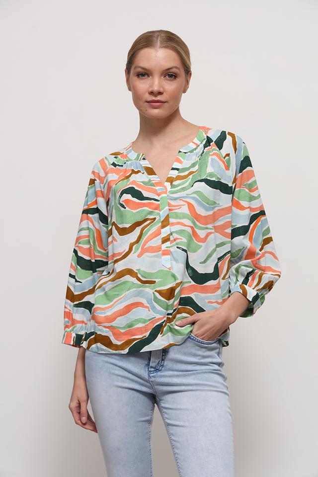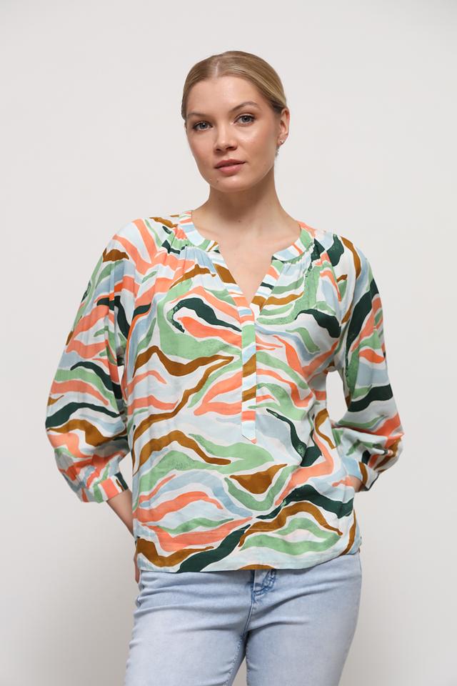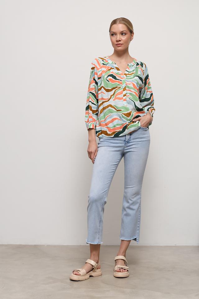 Блуза имеет свободный крой, V-образный вырез горловины и рукава длиной 3/4 с манжетами. Главная особенность модели – оригинальный абстрактный принт, выполненный в сочетании зелёных, оранжевых и голубых оттенков.