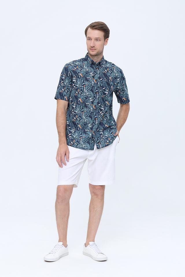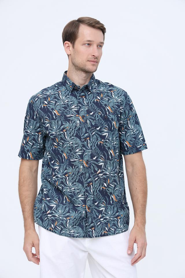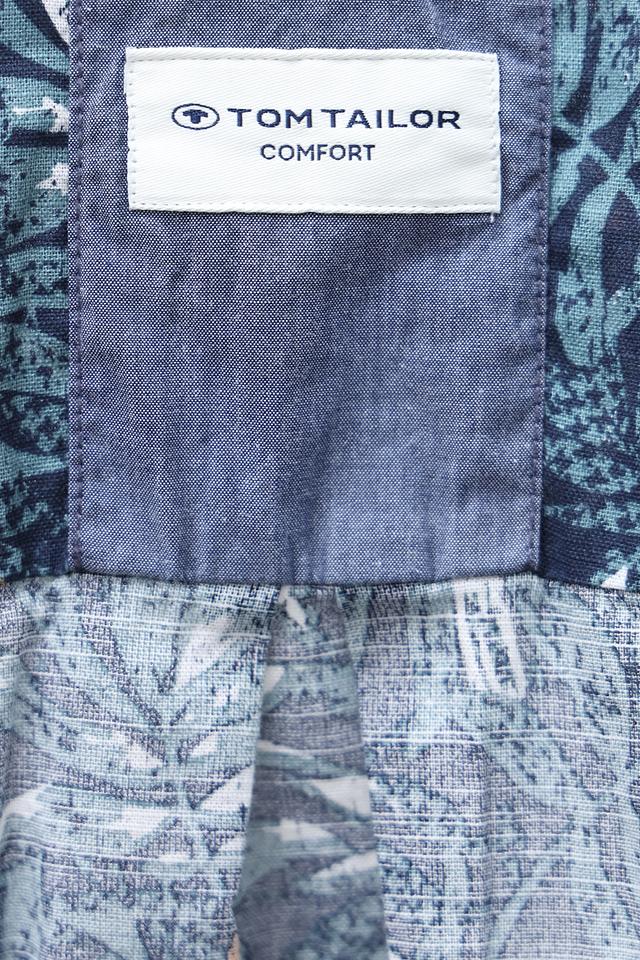 Мужская рубашка Tom Tailor синего цвета с коротким рукавом и ярким тропическим принтом. Изготовлена из 100% хлопка, обеспечивающего комфорт и воздухопроницаемость. Идеальный выбор для летнего гардероба. Состав: хлопок 100%