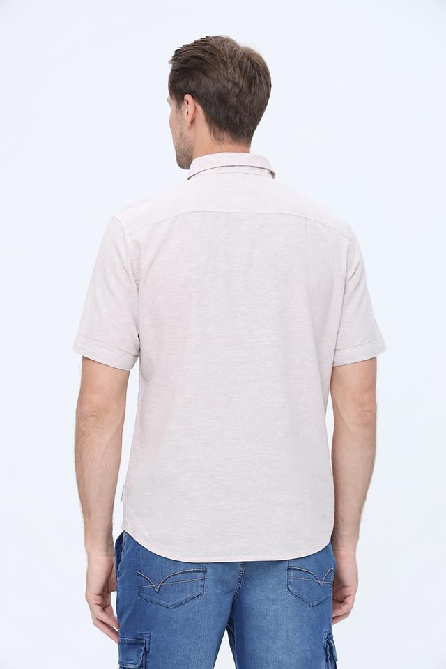 Рубашка имеет классический крой с короткими рукавами и воротником на пуговицах. На груди расположен накладной карман с пуговицей, добавляющий функциональности и стиля. Застежка на пуговицах по всей длине обеспечивает удобство надевания и снятия.