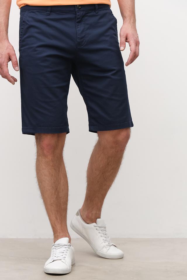 Цвет шорт – насыщенный темно-синий. На заднем кармане расположен небольшой логотип бренда. Шорты застегиваются на молнию и пуговицу. Боковые карманы удобны для хранения мелких предметов.