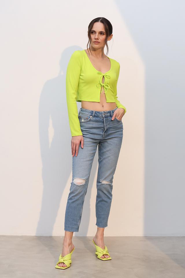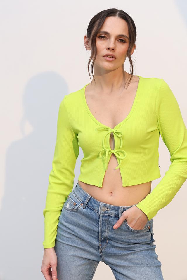 Жакет Tom Tailor цвета лайм – это стильная модель с длинными рукавами и оригинальным дизайном. Укороченный крой и завязки на декольте придают образу кокетливость и современность. Состав: вискоза 93%, эластан 7%