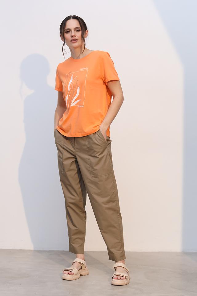Эта футболка от Tom Tailor станет ярким акцентом в вашем гардеробе. Выполнена в насыщенном оранжевом цвете и украшена стильным графическим принтом с надписью "FLUIDITY" и изображением растительных элементов.