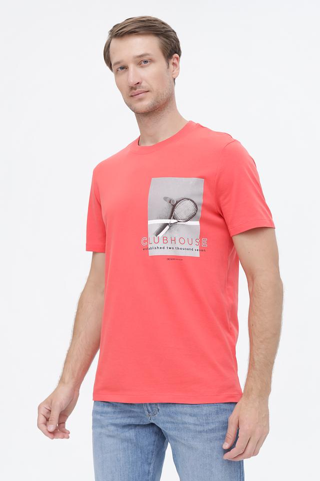 Модель имеет классический крой с короткими рукавами и круглым вырезом горловины. Основной цвет футболки – коричневый. На передней части футболки расположен графичный принт с изображением теннисного корта и надписью "CLUBHOUSE". Принт выполнен в белых, серых и чёрных оттенках, что создает контрастный и привлекательный вид.