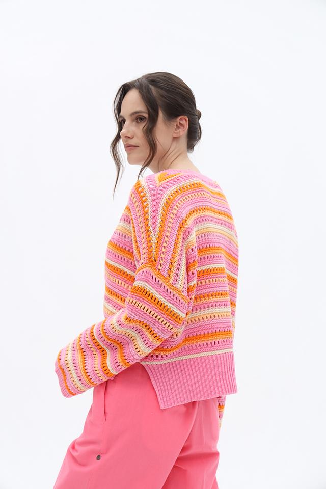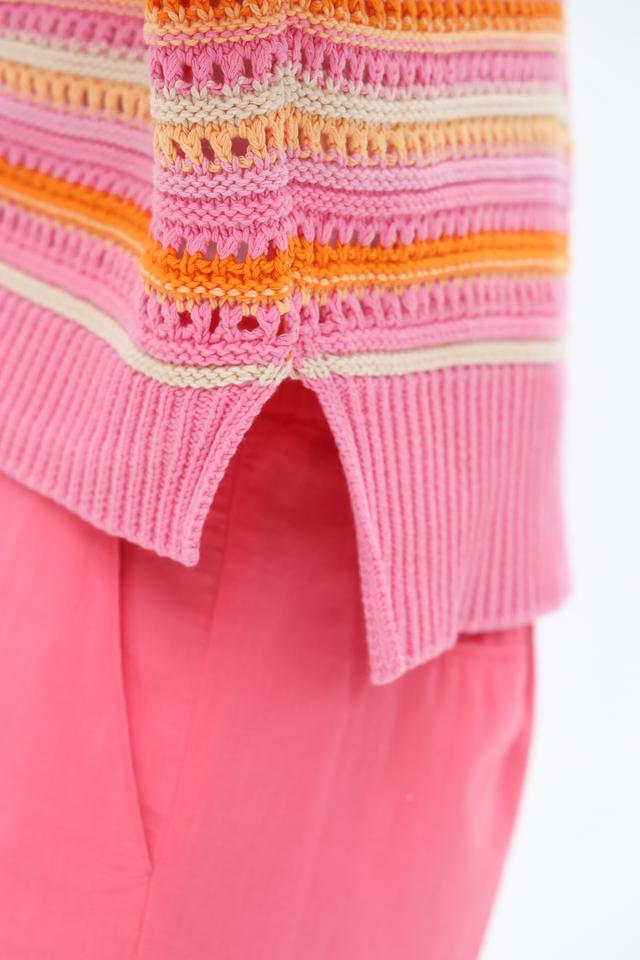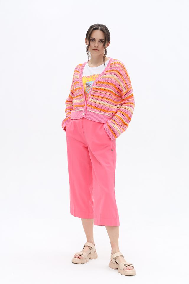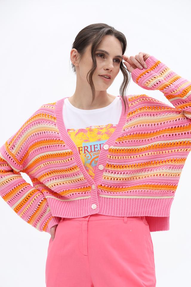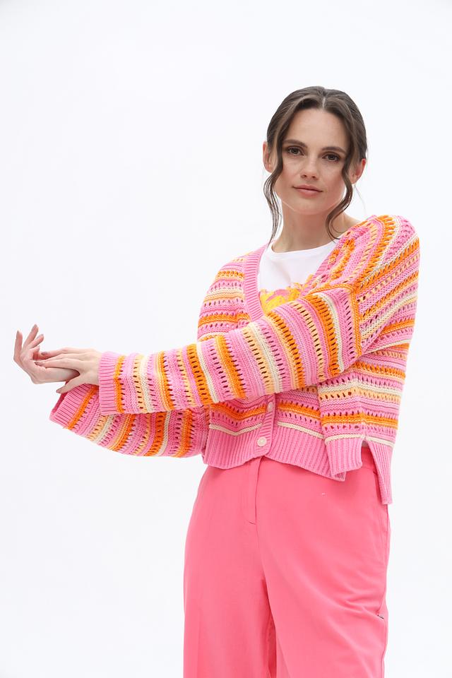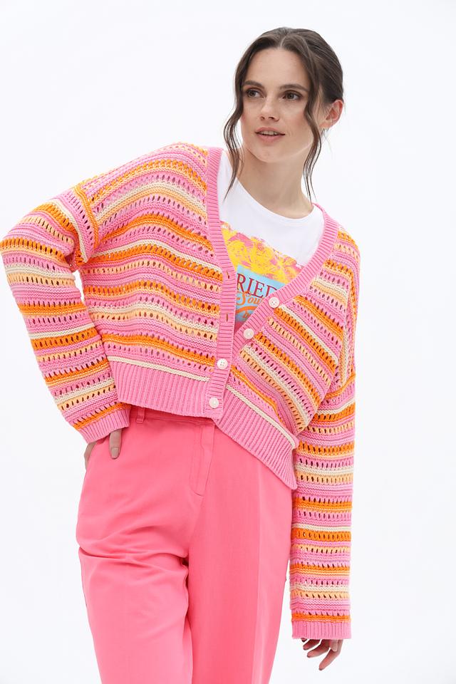 Кардиган имеет полосатый дизайн в розовой гамме с добавлением оранжевых и желтых оттенков, что делает его особенно привлекательным. V-образный вырез и застежка на пуговицы позволяют регулировать степень открытости.