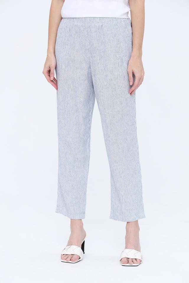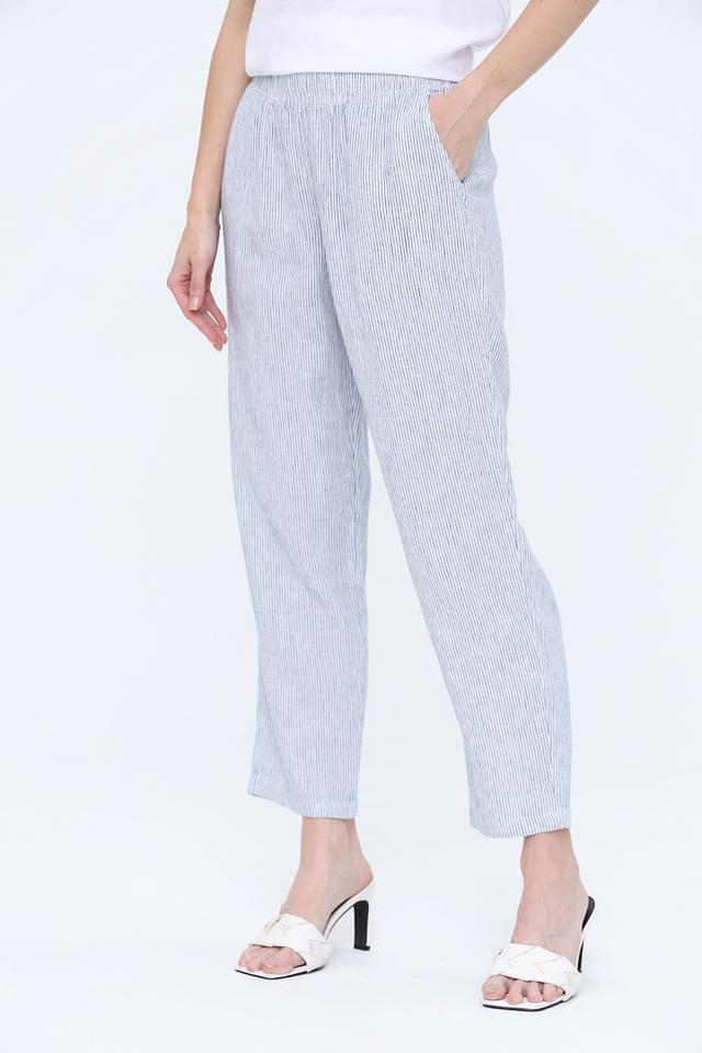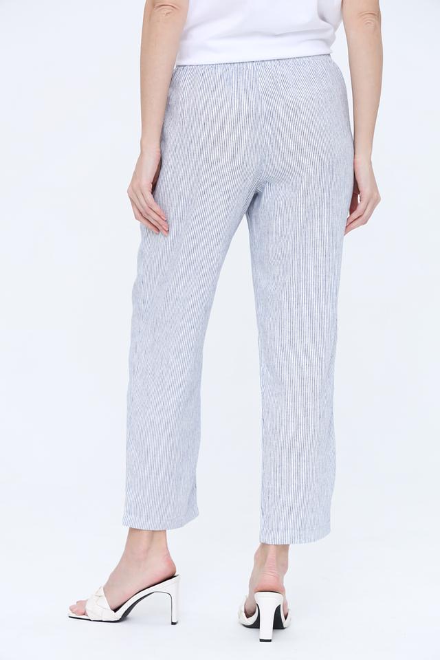 Брюки выполнены из сочетания льна и вискозы, что делает их приятными на ощупь и хорошо пропускающими воздух. Голубая полоска добавляет образу свежести и лёгкости.