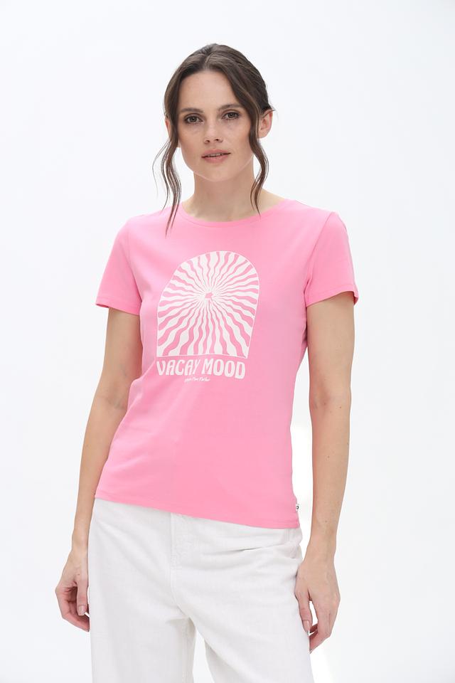 Футболка имеет классический прямой крой и короткие рукава. Главной особенностью модели является яркий графический принт на передней части с надписью "VACAY MOOD" и изображением стилизованного солнца. Принт выполнен в белом цвете, что создает контрастный и привлекательный вид.